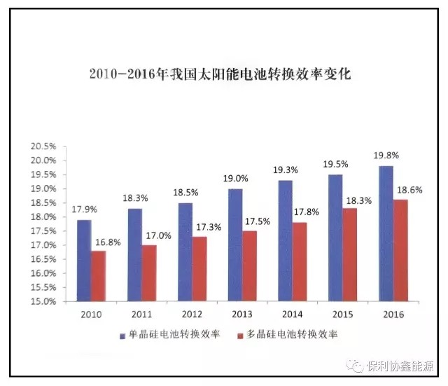 高效電池產(chǎn)業(yè)化進(jìn)程加速:在內(nèi)外部環(huán)節(jié)的共同推動(dòng)下,我國(guó)光伏企業(yè)加大工藝技術(shù)研發(fā)力度,生產(chǎn)工藝水平不斷進(jìn)步,P型單晶及多晶電池技術(shù)持續(xù)改進(jìn),常規(guī)產(chǎn)線平均轉(zhuǎn)換效率分別達(dá)到19.8%和18.6%,連年持續(xù)穩(wěn)定增長(zhǎng)。