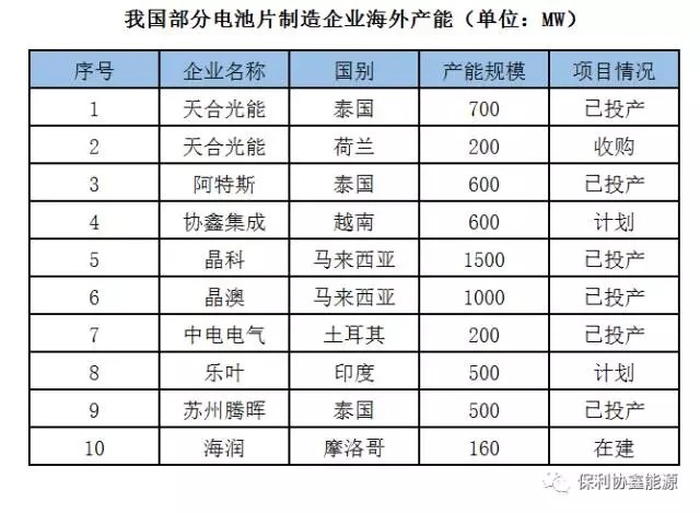 企業(yè)積極實(shí)施全球制造策略:在國(guó)際貿(mào)易壁壘影響和我國(guó)政策引導(dǎo)之下,我國(guó)光伏企業(yè)加速全球布局計(jì)劃。據(jù)不完全統(tǒng)計(jì),截至2016年底,我國(guó)已建成投產(chǎn)海外電池片產(chǎn)能超過(guò)6GW,在建及計(jì)劃產(chǎn)能超過(guò)3GW。