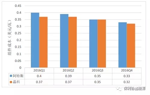 組件生產(chǎn)成本持續(xù)下降:據(jù)主要組件企業(yè)披露的數(shù)據(jù),至2016年底,我國(guó)主要電池企業(yè)生產(chǎn)成本基本降至0.4美元/瓦左右,領(lǐng)先企業(yè)的垂直一體化組件生產(chǎn)成本已降至0.32美元/瓦,同比下降17%左右。與2011年的0.9美元/瓦相比,降幅達(dá)到64%。