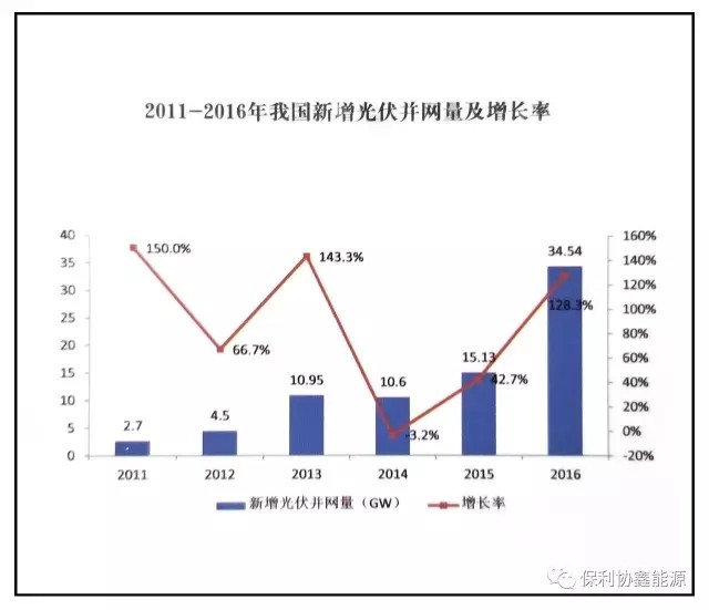 新增裝機(jī)規(guī)模首超風(fēng)電:2016年我國(guó)光伏發(fā)電裝機(jī)容量加快增長(zhǎng),全年新增裝機(jī)3459萬(wàn)千瓦,首次超過(guò)風(fēng)電,約占全年全球新增裝機(jī)容量的一半。截至2016年底,我國(guó)太陽(yáng)能光伏發(fā)電裝機(jī)容量7742萬(wàn)千瓦,占全國(guó)電源總裝機(jī)容量的4.7%。