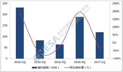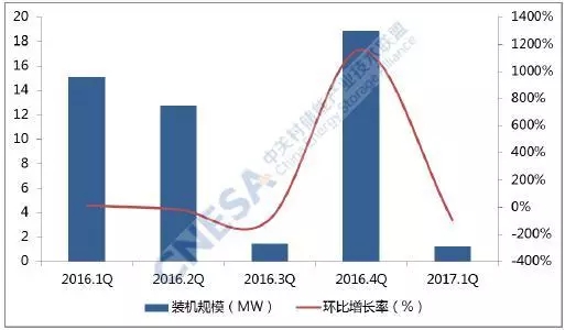 圖4 連續(xù)五個(gè)季度新增投運(yùn)項(xiàng)目的裝機(jī)分布及環(huán)比增長(zhǎng)率(中國(guó))