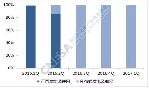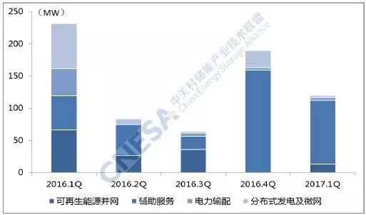 從應(yīng)用分布上看,投運(yùn)項(xiàng)目在輔助服務(wù)領(lǐng)域的裝機(jī)規(guī)模最大,為99.1MW,同比增長(zhǎng)87%,環(huán)比2016年四季度下降38%。