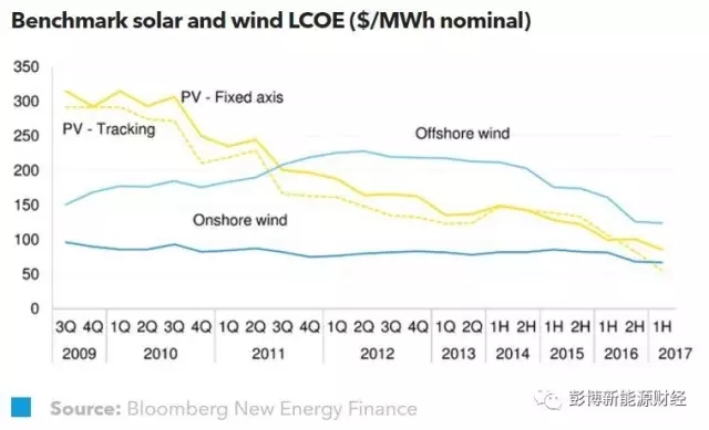 全球新增光伏項(xiàng)目成本持續(xù)下降:組件價(jià)格較2016年下降30%;發(fā)達(dá)國家運(yùn)維成本及融資成本都在下降。2017年上半年,我們認(rèn)為全球標(biāo)桿(fix-axis)光伏度電成本已經(jīng)從2016年下半年的$100/MWh下降至$86/MWh,(single-axis)光伏度電成本更是下降33%,至$56/MWh。我們的分析首次表明:帶有追蹤器的光伏系統(tǒng)度電成本可以降至比陸上風(fēng)電更低的水平。