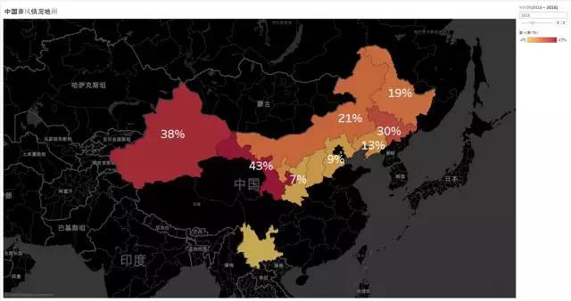 2014至2016年,中國部分地區(qū)棄風呈攀升趨勢,日益惡化:2016年棄風總量高達497億千瓦時,是2014年的4倍!上圖中顏色最深的甘肅、新疆、內(nèi)蒙古、吉林和黑龍江五個地區(qū),3年棄風量就接近800億千瓦時,相當于天津市2015年全年的用電量。其中甘肅省的棄風率更是從2014的11%飆升到2016年的43%!