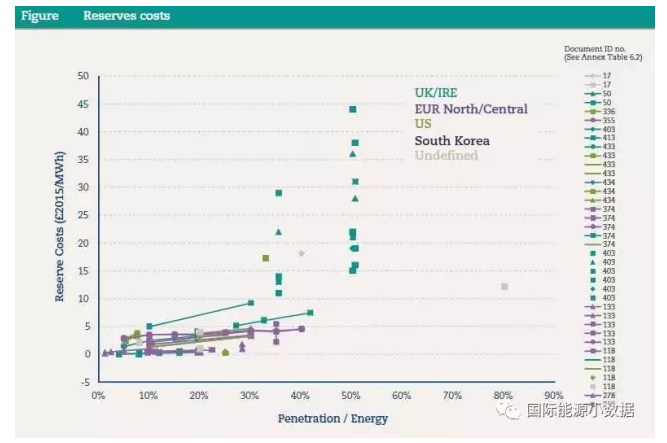 風(fēng)電光伏的系統(tǒng)成本首先要考慮相應(yīng)增加備用電源容量(reserve requirements)。如果風(fēng)電光伏發(fā)電占到電力需求的30%情況下,因?yàn)閭溆秒娫匆笤黾拥某杀炯s為5英鎊/兆瓦時(shí)(合人民幣4.3分/千瓦時(shí))。