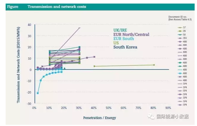 第三項(xiàng)要考慮的系統(tǒng)成本因素是因?yàn)槲{間歇性可再生能源電網(wǎng)所需要的“加固”和“靈活性”改造,此項(xiàng)成本約在5-20英鎊/兆瓦時(shí)(合人民幣0.04-0.17元/千瓦時(shí))。越是不靈活的電網(wǎng),改造成本就越高。但是由于電網(wǎng)本身需要不斷的技術(shù)改造,并和周邊地區(qū)或國(guó)家聯(lián)網(wǎng),所以電網(wǎng)改造的成本并不應(yīng)該全部算在可再生能源頭上。