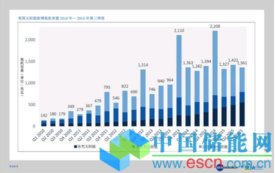 美國太陽能市場(chǎng)保持著破紀(jì)錄的發(fā)展勢(shì)頭,在2015年第三季度中新增裝機(jī)容量為1361兆瓦,在2015年太陽能市場(chǎng)前三個(gè)季度中提升了4.1吉瓦。得益于住宅太陽能市場(chǎng)的快速發(fā)展,2015年第三季度成為美國太陽能裝機(jī)容量連續(xù)增長(zhǎng)的第八個(gè)季度,太陽能裝機(jī)容量增加超過1吉瓦。