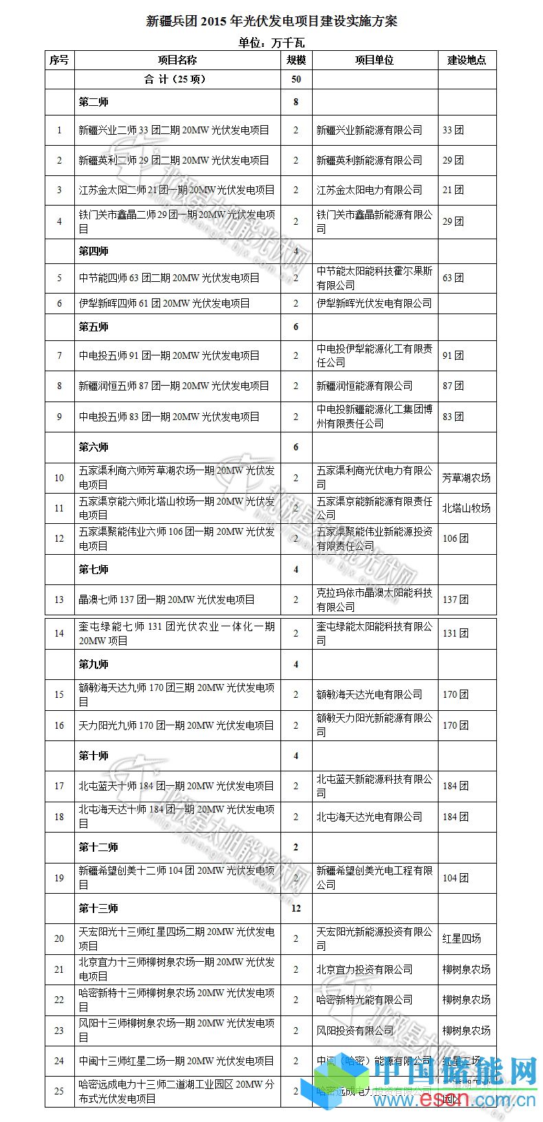 中國儲能網(wǎng)訊:在綜合考慮2014年項(xiàng)目建設(shè)情況、電力市場條件等因素的基礎(chǔ)上,2015年,新疆兵團(tuán)將50萬千瓦發(fā)電規(guī)模安排予25個(gè)光伏電站項(xiàng)目,具體名單見下表: