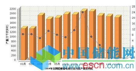 中國儲能網(wǎng)訊:根據(jù)國家統(tǒng)計局公布數(shù)據(jù),2014年1~12月全國鉛酸蓄電池行業(yè)累計完成產(chǎn)量同比增長4.58%。其中:12月份完成產(chǎn)量同比增長-7.87%。2014年全國鉛酸蓄電池行業(yè)月度產(chǎn)量及同比如下圖所示。