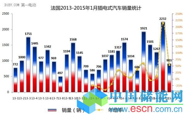 法國(guó)純電動(dòng)汽車的銷量進(jìn)一步增長(zhǎng),新注冊(cè)903輛,比2014年1月多出54%,比2013年1月增加17%。