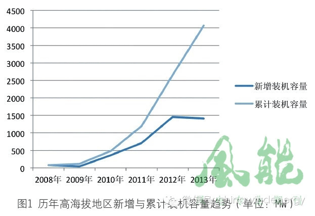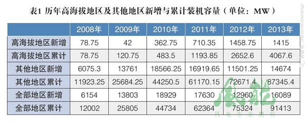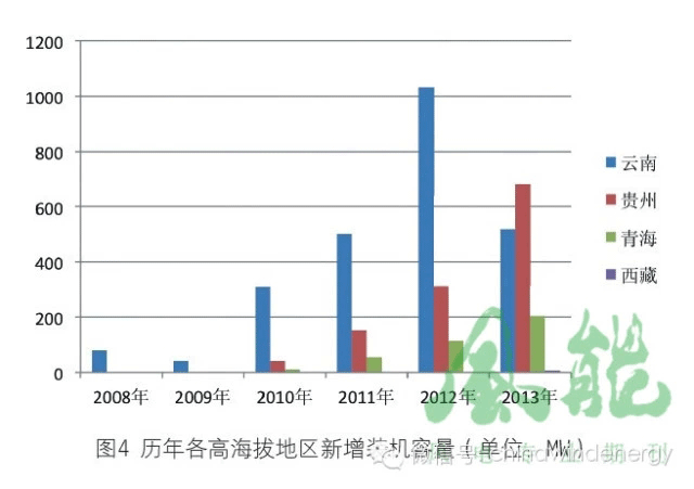 據(jù)中國可再生能源學(xué)會風(fēng)能專業(yè)委員會的數(shù)據(jù)顯示,中國從2008年開始在高海拔地區(qū)有風(fēng)電裝機,到2013年底累計裝機容量達到4067.6MW。在此6年間,高海拔地區(qū)新增裝機量總體呈現(xiàn)以上升為主,期間略有波動的趨勢。其中,除2009年和2013年與前一年的新增裝機量相比略有下降外,2008年、2010年、2011年和2012年高海拔地區(qū)的新增裝機容量都比前一年有所上升。2013年,中國高海拔地區(qū)新增裝機容量為1415MW,占全部新增裝機容量的8.79%,相比2012年的1458.75MW及11.26%的占比,各數(shù)據(jù)均有所下降。與2012年相比,新增裝機容量在2013年下降的比較小,而占比卻下降的比較大,這從側(cè)面印證了2012年高海拔以外地區(qū)的新增裝機量曾出現(xiàn)較大的下降。雖然2012年以前新增裝機容量上升速度較快,但由于此前的裝機基數(shù)并不大,表現(xiàn)在累計裝機增長上并不明顯,與之相反的是,2011年以后高海拔地區(qū)的新增裝機量達到了一定的量級,雖然在2013年有所下降,但累計裝機上升的卻更為明顯。