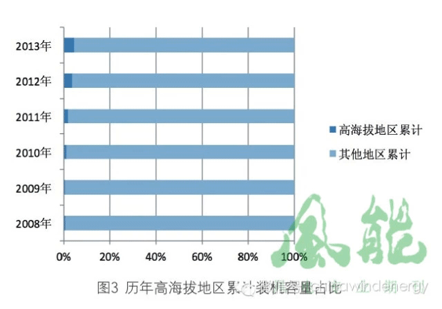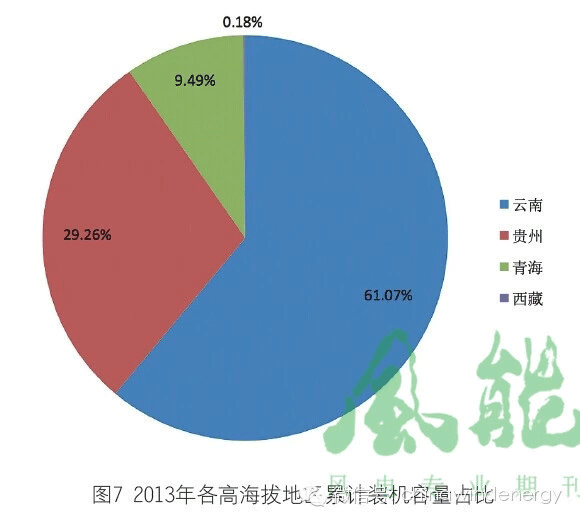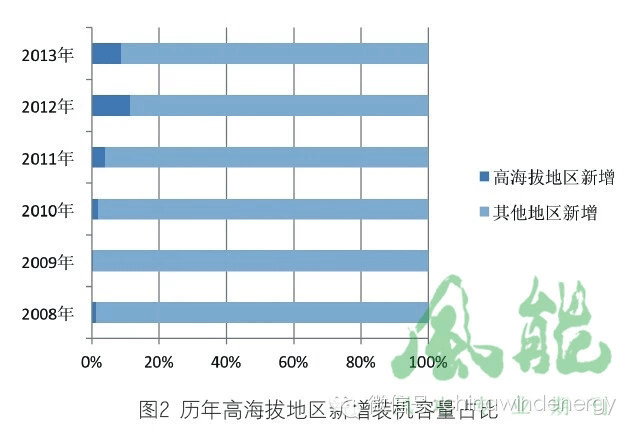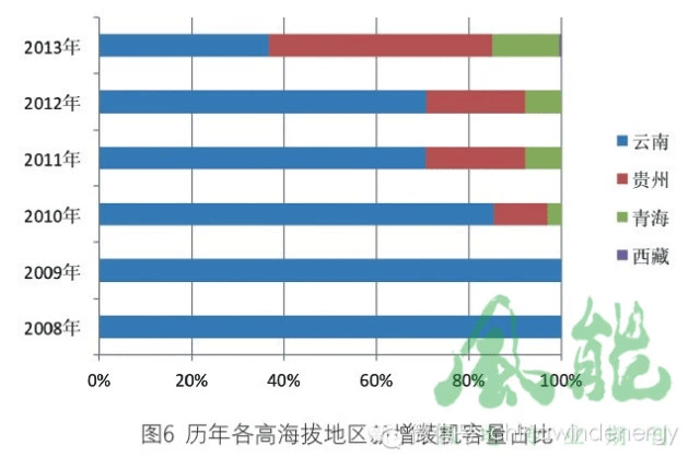 在占比方面,雖然2013年高海拔地區(qū)的新增裝機容量占比有所下降,但在累計裝機容量占比趨勢上始終表現(xiàn)出上升態(tài)勢。出現(xiàn)新增裝機容量占比略有下降而累計裝機容量占比上升的情況,從側(cè)面說明中國高海拔地區(qū)的風(fēng)電裝機起步較晚,但其發(fā)展跑贏了總體裝機趨勢。