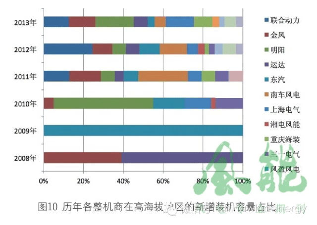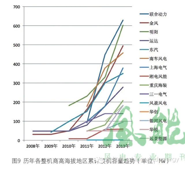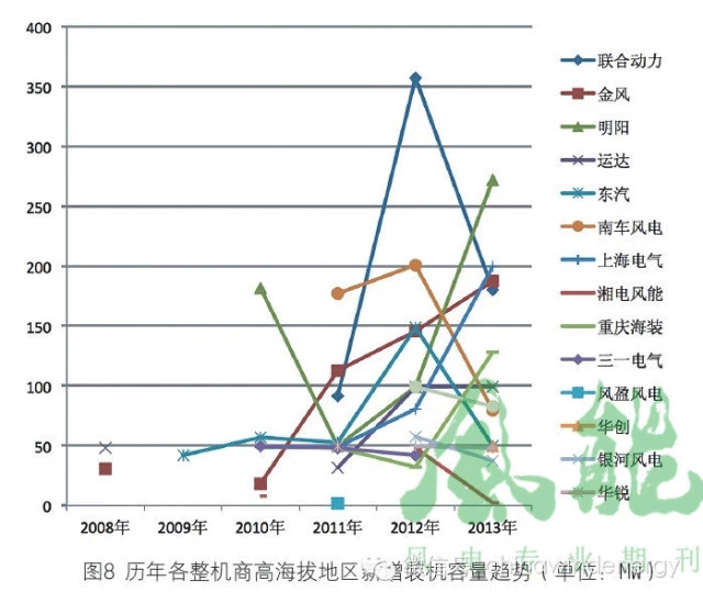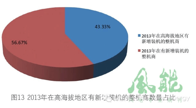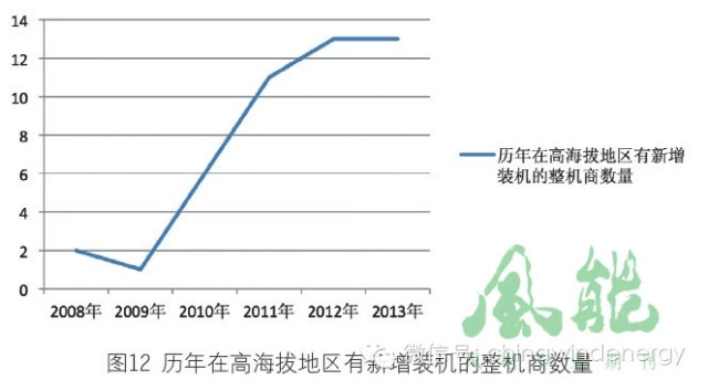 歷年在高海拔地區(qū)有新增裝機的整機商數(shù)量,除2009年比2008年少了1家外,整體上處于不斷增加的趨勢。整機商數(shù)量最高時的2012年和2013年均為13家。2013年在高海拔地區(qū)有裝機的整機商數(shù)量是當年在中國有風(fēng)電裝機的整機商數(shù)量的43.33%。