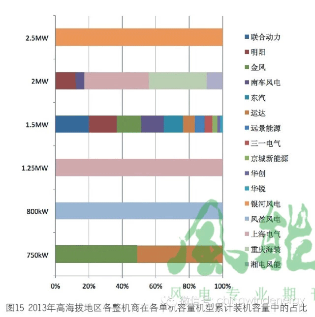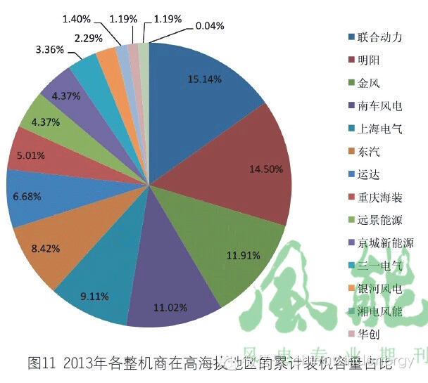 由圖10可以看出,各整機商在高海拔地區(qū)的新增裝機占比呈現(xiàn)細分化趨勢,一家獨大的局面逐步減弱,市場被越來越多的整機商所分割。2012年在高海拔地區(qū)新增裝機量占比最高的整機商是聯(lián)合動力,達到了24.47%;2013年在高海拔地區(qū)新增裝機量占比最高的整機商是明陽,達到了19.22%。