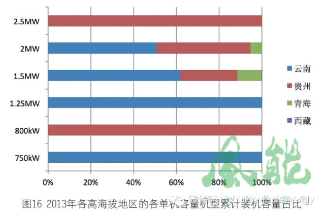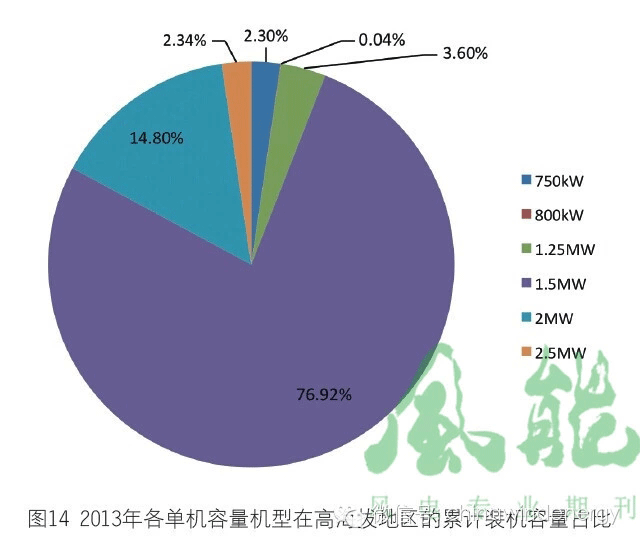 2013年各單機容量的風(fēng)電機組中,在高海拔地區(qū)累計裝機容量占比最高的是1.5MW型機組,達76.92%。其次是2MW機組,為14.8%。2.5MW和750kW機組分別占比在2.34%和2.3%左右。占比最小的是800kW型機組,是由風(fēng)盈風(fēng)電在2012年貴州安裝的2臺。