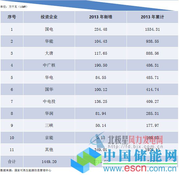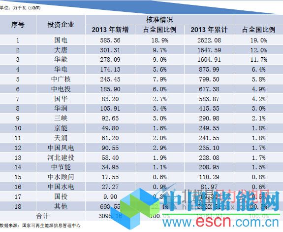表1:2013年主要投資企業(yè)核準(zhǔn)容量統(tǒng)計(jì)表