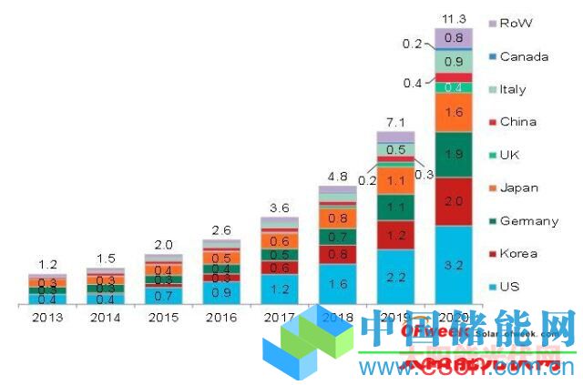 到2020年,以電池容量計,全球儲能系統(tǒng)累計安裝量將達到31.9GWh左右,相當于屆時全球電動汽車用電池累計產(chǎn)量的20%以上。美國仍占據(jù)頭名,但德國上升至第二位,日本也超越韓國排名第三。
