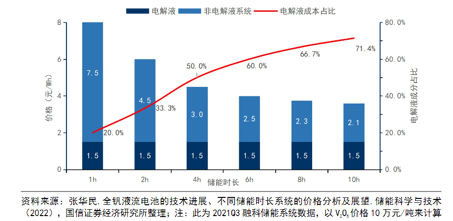 從經(jīng)濟(jì)性上看,全釩液流電池儲(chǔ)能的初始投資成本在2.5元-7.5元/Wh,時(shí)長越大,單瓦時(shí)的投建成本越低,8小時(shí)以上可以降到2元/Wh左右,接近鋰電儲(chǔ)能。而且,全釩液流電池的壽命長達(dá)20年,是鋰電池的2倍,這進(jìn)一步攤低了初始投資的單位成本,成本更優(yōu)于鋰電儲(chǔ)能系統(tǒng)。即便是20年壽命到期,釩液流電池電解液的殘值和循環(huán)利用價(jià)值也高達(dá)30%以上,全生命周期成本更低。未來,隨著更多全釩液流電池儲(chǔ)能項(xiàng)目的上馬,很容易在市場層面引發(fā)共鳴。