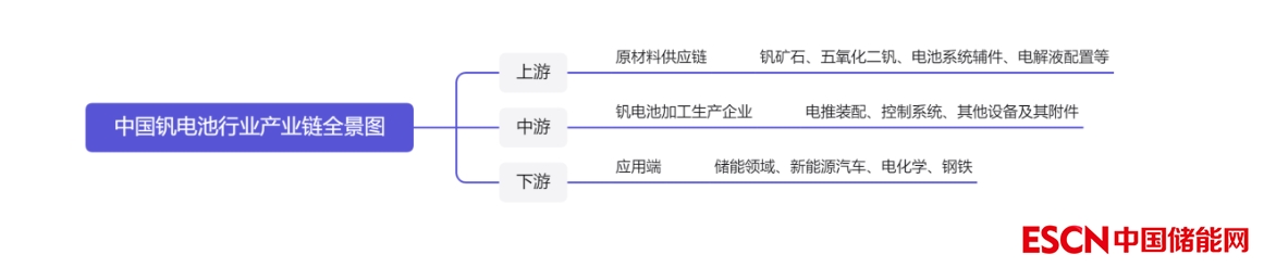 釩電池產(chǎn)業(yè)鏈由上游的原材料供應鏈、中游的釩電池加工生產(chǎn)企業(yè)以及下游的應用端組成。