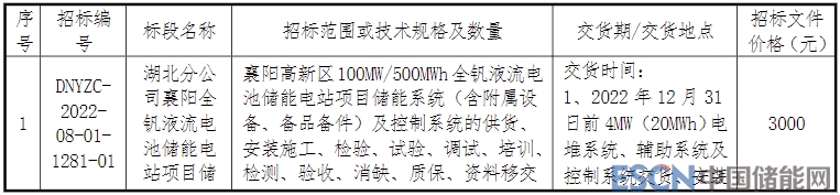 中國儲(chǔ)能網(wǎng)訊:8月26日,國家電力投資集團(tuán)有限公司發(fā)布二〇二二年度第四十八批集中招標(biāo)招標(biāo)公告。據(jù)了解,招標(biāo)內(nèi)容包含湖北分公司襄陽全釩液流電池儲(chǔ)能電站項(xiàng)目儲(chǔ)能系統(tǒng)及控制系統(tǒng)設(shè)備、電解液采購。