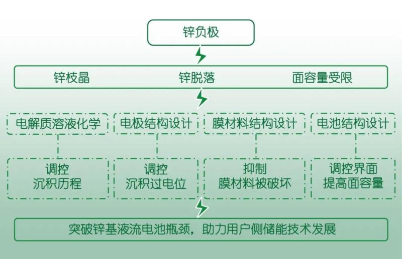 針對鋅負(fù)極存在的鋅枝晶、鋅脫落、面容量受限等主要問題:從電解質(zhì)溶液化學(xué)的角度入手,可以調(diào)控鋅沉積歷程;從電極結(jié)構(gòu)設(shè)計角度切入,可以調(diào)控鋅沉積過電位;從膜材料結(jié)構(gòu)角度來設(shè)計,可以抑制金屬鋅對其造成的破壞;從電池結(jié)構(gòu)角度進(jìn)行優(yōu)化,可以調(diào)控膜與電極界面空間,提高鋅基液流電池面容量。最終突破鋅基液流電池的“瓶頸”,助力用戶側(cè)儲能技術(shù)的發(fā)展。