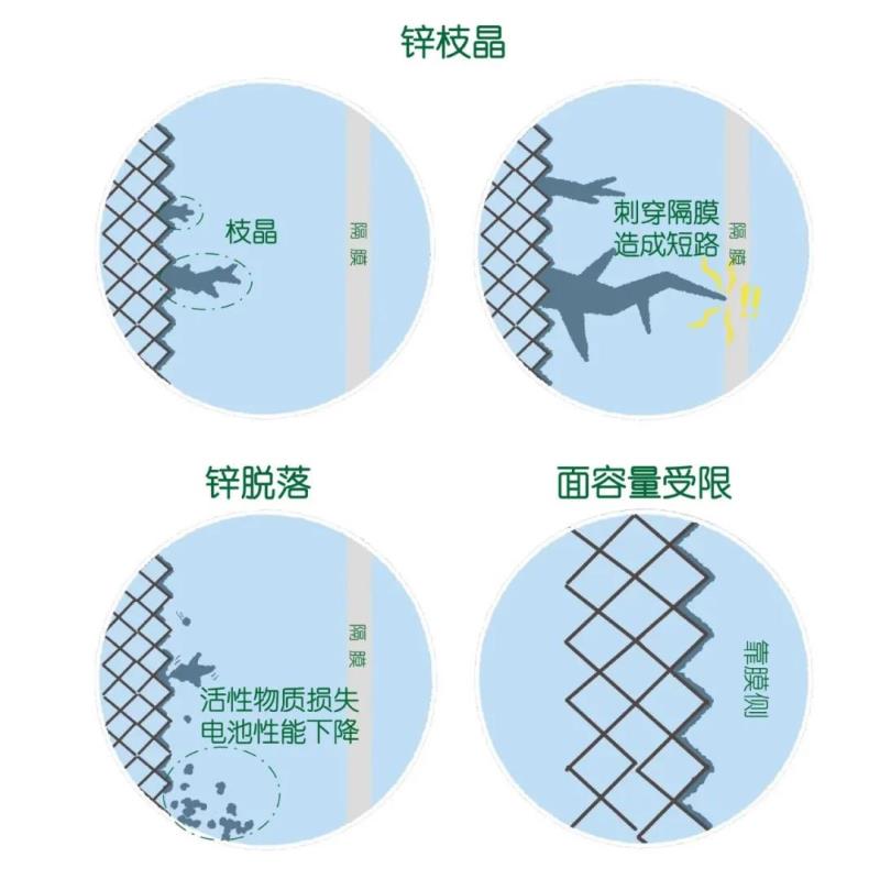 鋅枝晶:電池充電時,電極表面濃差極化增大,電極表面附近離子濃度降低,反應(yīng)物離子更容易擴(kuò)散至電極表面的凸起處,誘導(dǎo)了鋅枝晶的進(jìn)一步生長。隨著枝晶的不斷生長,最后刺破隔膜導(dǎo)致電池短路失效。