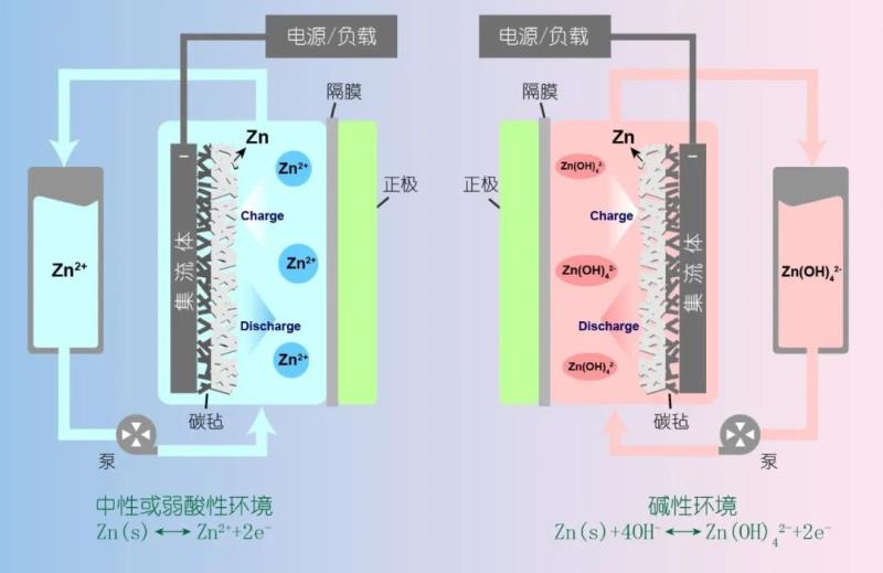 通常,鋅基液流電池(ZFBs)負(fù)極電解液的活性物質(zhì)是Zn 2+(中性或弱酸性環(huán)境)或 Zn(OH)42-(堿性環(huán)境)。在充電過程中,負(fù)極側(cè)的Zn 2+或Zn(OH)42-得到電子形成金屬鋅,同時正極側(cè)的活性物質(zhì)則被氧化。放電過程則與之相反,負(fù)極側(cè)的鋅溶解形成Zn 2+或 Zn(OH)42-,同時正極側(cè)的活性物質(zhì)被還原。