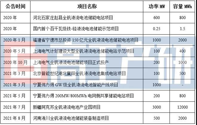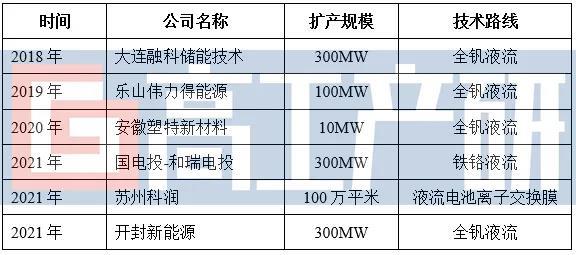 2021年國內主要液流電池產業(yè)鏈擴產項目(部分)
