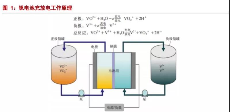 全釩液流電池,壽命長(zhǎng)、規(guī)模大、安全可靠。釩電池全稱為全釩氧化還原液流電池(Vanadium Redox Battery,VRB),為液流電池的一種,是一種基于金屬釩元素的氧化還原的電池系統(tǒng),其電解液是不同價(jià)態(tài)的釩離子的硫酸電解液。根據(jù)電化學(xué)反應(yīng)中活性物質(zhì)的不同,液流電池可分為釩液流電池、鋅基液流電池、鐵鉻液流電池等。其中全釩液流電池,壽命長(zhǎng)、規(guī)模大、安全可靠的優(yōu)勢(shì)尤為突出,成為規(guī)模儲(chǔ)能的首選技術(shù),在調(diào)峰電源系統(tǒng)、大規(guī)模風(fēng)光電系統(tǒng)儲(chǔ)能、應(yīng)急電源系統(tǒng)等領(lǐng)域具有廣闊的應(yīng)用前景。