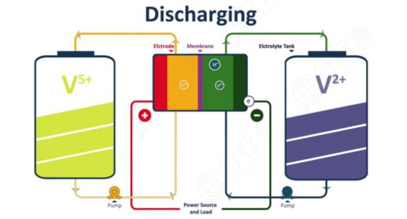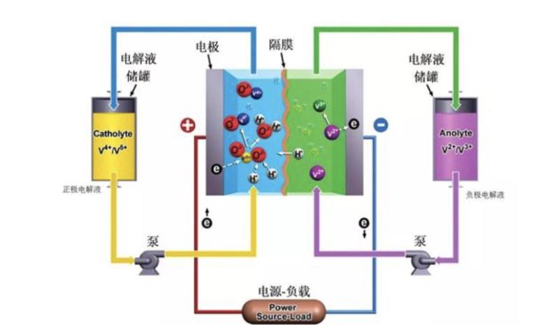釩電池全稱為全釩氧化還原液流電池(Vanadium Redox Battery,VRB),為液流電池的一種,是一種基于金屬釩元素的氧化還原的電池系統(tǒng),其電解液是不同價態(tài)的釩離子的硫酸電解液。