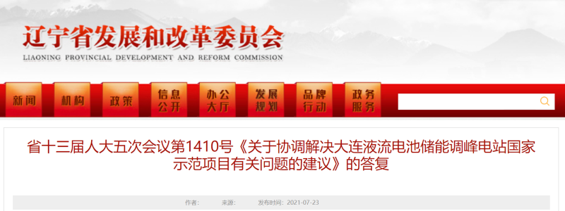 省十三屆人大五次會議第1410號《關(guān)于協(xié)調(diào)解決大連液流電池儲能調(diào)峰電站國家示范項目有關(guān)問題的建議》的答復