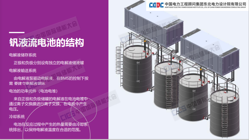我簡(jiǎn)單介紹釩液流電池的工作原理。這張圖左邊是正極罐,右邊是負(fù)極罐,正極負(fù)極的釩離子通過化學(xué)反應(yīng),通過中間的交換膜進(jìn)行離子交換,就在電極上形成電壓,形成了電池的基本原理。這張照片可以看出來釩液流電池的基本結(jié)構(gòu),它是由幾個(gè)系統(tǒng)組成的,液罐是電解液的存儲(chǔ)系統(tǒng),正極和負(fù)極電解液是獨(dú)立存儲(chǔ)的,還有電解液輸送系統(tǒng)。電解液泵在BMS的控制下,按照要求向電池和電堆按需要建立電解液循環(huán)。電池電堆是釩液流電池的核心,是一個(gè)功率元件,來自正極和負(fù)極的電解液在電池電堆中通過離子交換膜進(jìn)行離子交換,在電極中產(chǎn)生電壓,最后啟動(dòng)電池。在這個(gè)轉(zhuǎn)換過程中,它的熱量是比較多的,損耗比較大,需要配一套冷卻系統(tǒng),把電解液的溫度控制在合適的范圍內(nèi)。