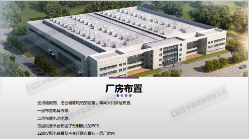 這張圖是這個(gè)電站的效果圖,實(shí)際建設(shè)的情況和它也相差不多,受到用地限制,因?yàn)槭浅鞘兄行碾娬?,用地是征地來的。所以我們采用了多層布置,一層布置電解液的液罐,二層布置液堆,在頂層設(shè)計(jì)了一個(gè)高的高鐵臺(tái),用來布置PCS的集裝箱預(yù)制艙。220KV配電裝置和變壓器布置在一層廠房?jī)?nèi),實(shí)現(xiàn)了和周邊環(huán)境的一致性。