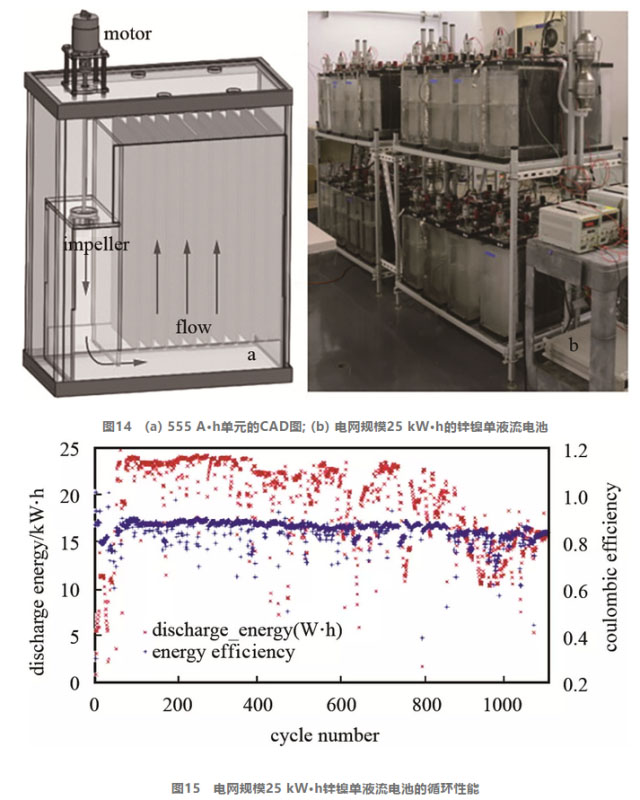 在國外,紐約城市大學(xué)能源研究所率先開始對單液流鋅鎳電池進行研究,于2009年開發(fā)出鋅鎳單液流電池,2014年研制出單體容量555 A·h的鋅鎳單液流電池,目前已經(jīng)組裝起了25 kW·h的儲能系統(tǒng)并將之投入規(guī)?;瘧?yīng)用之中:將30個833 W·h的大型電池串聯(lián)起來,如圖14所示。圖15顯示了電網(wǎng)規(guī)模下25 kW·h電池的循環(huán)性能結(jié)果,可以看出電池在大約1000個循環(huán)中保持了80% 以上的能量效率。