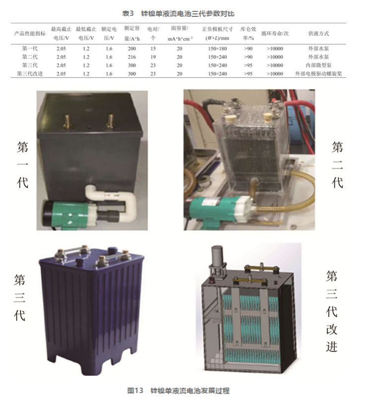 鋅鎳單液流電池已經(jīng)經(jīng)過了基礎(chǔ)技術(shù)研究、原理驗證、小規(guī)模中試等階段,實驗室原理電池循環(huán)壽命可以超過一萬次。目前,單液流鋅鎳電池已經(jīng)研發(fā)出了三代規(guī)?;a(chǎn)品。第一代鋅鎳單液流電池在國家電網(wǎng)公司和國內(nèi)的兩所大學(xué)里面進行了初步演示與應(yīng)用,結(jié)果發(fā)現(xiàn)該電池運行效果良好,具有繼續(xù)開發(fā)的潛力,且浙江裕源儲能科技有限公司已經(jīng)開始生產(chǎn)。第二代產(chǎn)品的生產(chǎn)線基本完成,儲能規(guī)模已經(jīng)達到1 MW·h。我國張北國家風(fēng)光儲能示范區(qū)搭建了存儲容量為50 KW·h的單液流鋅鎳電池儲能系統(tǒng),由168個200 A·h 的單體電池串聯(lián)而成,能量效率可達80%。第三代產(chǎn)品300 A·h的電池正在優(yōu)化改進階段,具有很好的應(yīng)用前景。表3是三代產(chǎn)品及改進產(chǎn)品的性能參數(shù)。三代產(chǎn)品依次在容量上有所提升,圖13展示了實物圖。