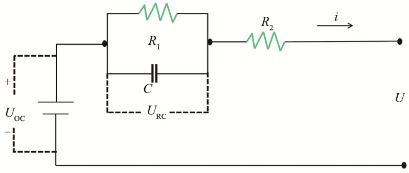 構(gòu)建能夠準確描述電池在充放電過程中內(nèi)部變化情況以及預(yù)測外部特性的系統(tǒng)模型可以加快鋅鎳單液流電池的工程化應(yīng)用進度。目前來講,從精度(越高越好)和計算量(越小越好)來講,等效電路二階模型用于鋅鎳單液流電池是較合適的:用電路元件來表示電池內(nèi)部的化學(xué)反應(yīng)過程,用并聯(lián)電容和電阻表示電池的極化,用串聯(lián)電阻表述歐姆內(nèi)阻,各個參數(shù)之間通過電路方程式聯(lián)系。圖12展示了單液流鋅鎳電池的等效電路模型示意圖。