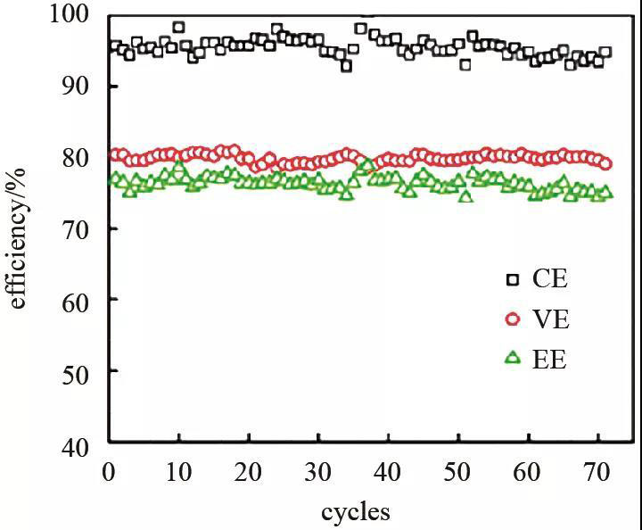 為了降低正極極化,張華民等設(shè)計了一種具有蛇形流場的電池結(jié)構(gòu),通過增強質(zhì)量傳輸來降低正極的極化[見圖10(b)],這種結(jié)構(gòu)可以將電流密度提高至接近80 mA/cm2 。與傳統(tǒng)結(jié)構(gòu)電池相比[見圖10(a)],在80 mA/cm2的電流密度下,蛇形流場結(jié)構(gòu)使得電池的能量效率提高了10.3%,在70次充放電循環(huán)中,效率沒有明顯下降,如圖11所示。同時指出,在80 mA/cm2的電流密度下,在0~40 ℃,電池充放電過程中的正極極化遠大于負極極化。正極的嚴重極化導(dǎo)致電池工作電流密度低,進而電池功率密度低且充放電效率不高,所以接下來迫切需要研究由快速離子、質(zhì)子和電子傳輸途徑組成的高活性氫氧化鎳電極,從而有效降低正極極化。