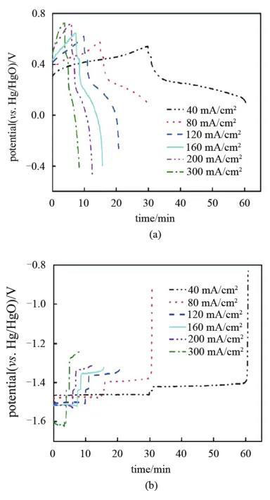 在低電流密度(40~80 mA/cm2)下,放電過程結(jié)束時負極電位突然升高,說明在低電流密度下,放電過程結(jié)束時負極呈現(xiàn)嚴重的濃差極化;與之對應(yīng),在高電流密度(120~300 mA/cm2)下,放電結(jié)束時正電極的電位突然降低,說明正極發(fā)生嚴重的濃差極化。