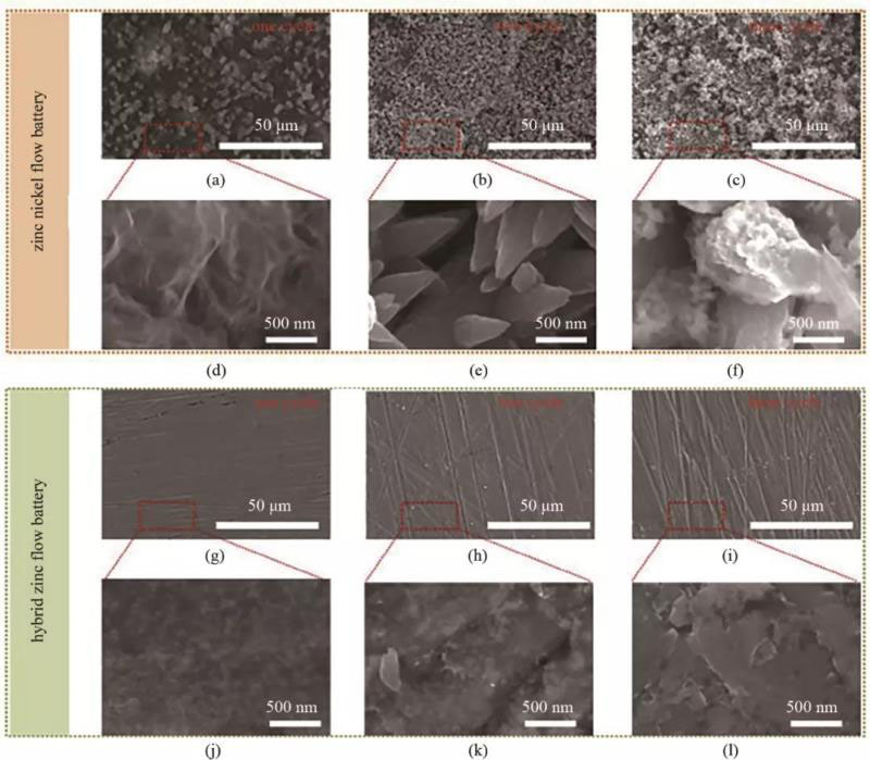 圖8 不同循環(huán)階段陽極的形貌:在傳統(tǒng)的鋅鎳液流電池中(a)、(d) 一個周期后, (b)、(e) 兩個周期后,(c)、(f) 經(jīng)過三個周期后; 復(fù)合鋅鎳液流電池 (g)、(j) 在一個循環(huán)后,(h)、(k) 經(jīng)過兩個循環(huán),(i) 、(l) 經(jīng)過3個循環(huán)后