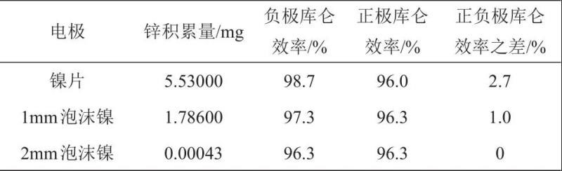 與前面提到抑制正極副反應(yīng)的做法類似,可以通過增強負極的副反應(yīng)來緩解鋅的積累??梢栽O(shè)計一種具有良好傳質(zhì)結(jié)構(gòu)和反應(yīng)面大的新型電極來調(diào)節(jié)負極副反應(yīng)。張華民等采用的方法是把負極材料從鎳片換成厚度2 mm的泡沫鎳,由于多孔材料有著高比表面積和良好的傳質(zhì)結(jié)構(gòu),副反應(yīng)消耗的電荷會隨著電極厚度的增加而增加,效果如圖6所示(電池A的負電極為鎳片,電池B的負電極為1 mm泡沫鎳,電池C的負電極為2 mm泡沫鎳)。結(jié)果如表2所示,負極材料是鎳片時,副反應(yīng)消耗的電荷為電池容量的1.3%,負極材料是2 mm厚的泡沫鎳時,副反應(yīng)消耗的電荷是電池容量的3.7% ,副反應(yīng)消耗的電荷占比明顯增大,從而使負極的庫侖效率從98.7%下降到96.3%,最終與正極相匹配。將負極材料由鎳片變?yōu)榕菽嚭?,鋅鎳單液流電池在400次循環(huán)中幾乎沒有鋅積累。