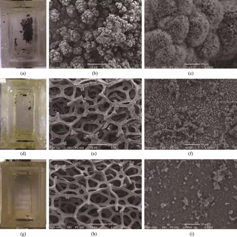 圖6 (a) 電池A、(d) 電池B和(g) 電池C底部的光學(xué)圖像;(b)~(c) 電池A、(e)~(f) 電池B和(h)~(i) 電池C重復(fù)循環(huán)后負極表面形貌的掃描電鏡