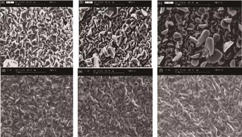 圖3 不同電流密度下沉積鋅在靜止電解質(zhì)中的表面形貌:(a)~(c) (電流密度50、 70、 100 mA/cm2) 和流動電解質(zhì)中的表面形貌:(d)~(f) (電流密度50, 70, 100 mA/cm2)