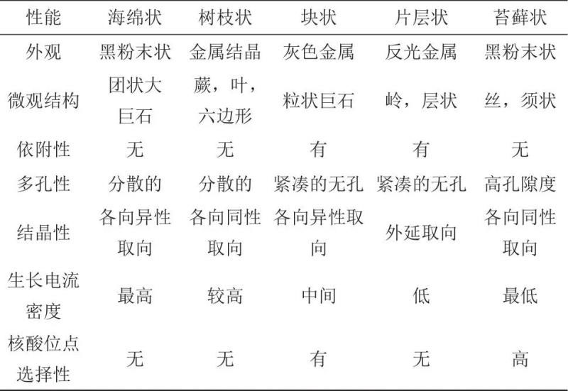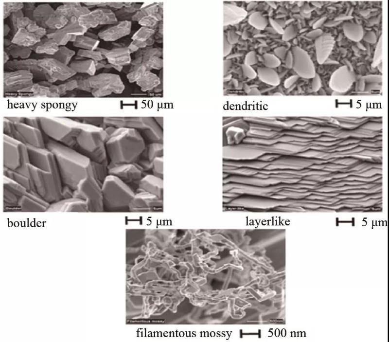 圖2 電沉積鋅在電極表面的形貌(海綿狀; 枝晶狀; 塊狀; 片層狀和苔蘚狀)(通過堿性電解質(zhì)電沉積)