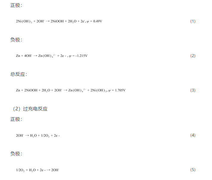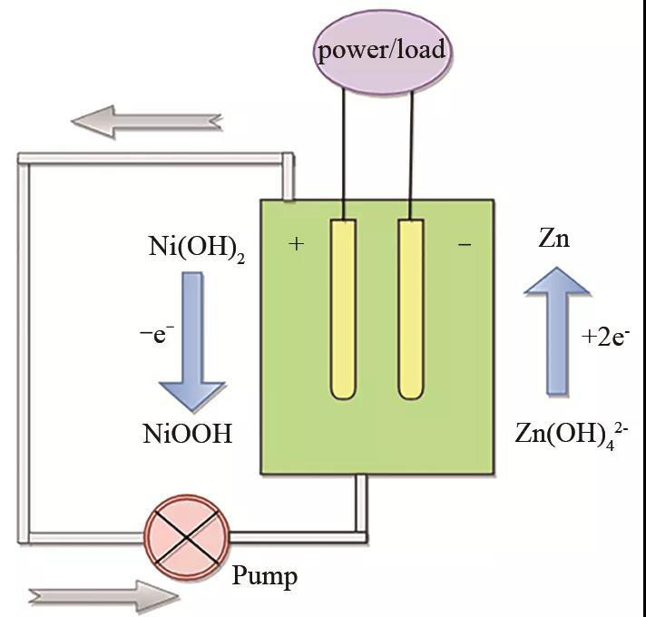 Pletcher等在2004年提出了單液流電池的概念,這種無膜結(jié)構(gòu)簡化了電池系統(tǒng),降低了成本。2007年,Cheng等開發(fā)出了鋅鎳單液流電池(ZNFB),這種電池具有非常明顯的優(yōu)點:①電解液單側(cè)循環(huán),消除了溶液的交叉污染問題,簡化了電池系統(tǒng);②不需要使用離子交換膜;③電池材料價格相對低廉。工作過程中,鋅鎳單液流電池一般經(jīng)歷三個階段:充電、靜置以及放電階段。電池工作中的電極反應(yīng)如下。