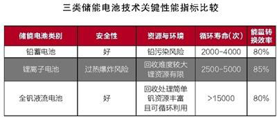 與其他儲(chǔ)能技術(shù)相比,全釩液流電池優(yōu)勢(shì)明顯:一是安全性高,儲(chǔ)能介質(zhì)是釩的化合物的水溶液,電池均勻性好,不會(huì)發(fā)生爆炸。二是容量大,儲(chǔ)能容量可達(dá)數(shù)百千瓦時(shí)至數(shù)百兆瓦時(shí),適合大規(guī)模儲(chǔ)能。三是循環(huán)壽命長(zhǎng),電池充放電循環(huán)次數(shù)在15000次以上,使用年數(shù)在15年到20年。四是環(huán)境友好,電解液可以反復(fù)循環(huán)使用。