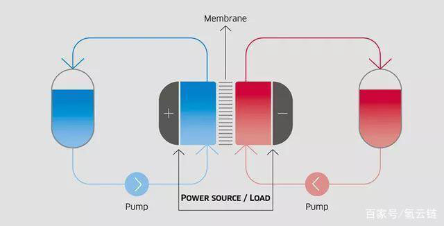 液流儲能電池是一種介于傳統(tǒng)電池和燃料電池之間的蓄電池,主要是由正負(fù)極、隔膜和泵組成,其中正負(fù)極被隔膜分開,并分別儲存在各自的電解液儲罐中。含金屬鹽類的電解液被泵入液流電池中,電解液里的金屬離子在正負(fù)極間進(jìn)行交換,從而產(chǎn)生電流。