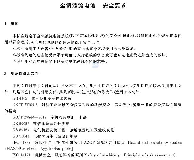 中國(guó)儲(chǔ)能網(wǎng)訊:據(jù)悉,國(guó)家標(biāo)準(zhǔn)《全釩液流電池 安全要求》近日發(fā)布,實(shí)施日期是2018年5月1日,主管部門(mén)是中國(guó)電器工業(yè)協(xié)會(huì),歸口單位是全國(guó)燃料電池及液流電池標(biāo)準(zhǔn)化技術(shù)委員會(huì),發(fā)布單位是中華人民共和國(guó)國(guó)家質(zhì)量監(jiān)督檢驗(yàn)檢疫總局、中國(guó)國(guó)家標(biāo)準(zhǔn)化管理委員會(huì)。詳情如下: