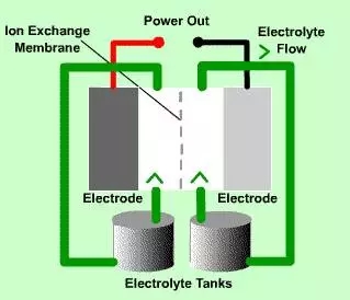 大部分液流電池都擁有兩個溶解有電活性物質(zhì)的液罐,即陽極電解液和陰極電解液。它們被泵入一塊中央電池,電池由一層可滲透共同離子的薄膜分隔,允許帶有正負電荷的原子通過。反過來,電流能夠為電池兩邊的正負電極充電。