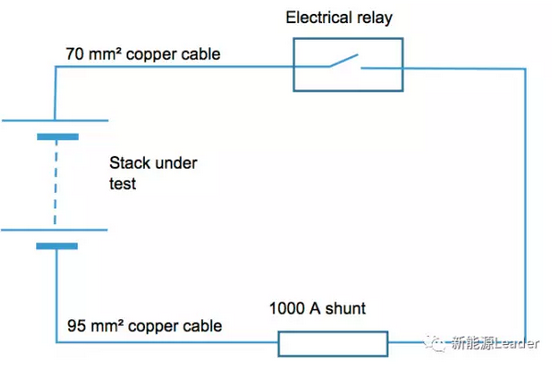 實驗中A.H.Whitehead采用SoC為83%的液流電池電解液,正負極的電解液量都為115L。用于短路測試的電路如下圖所示,電池組分別由20和27只電池串聯(lián)組成,電池的短路電流可以通過短路器進行測量,溫度測量則使用Pt1000熱電阻直接在電池組的外殼和正負極的極柱上進行測量。