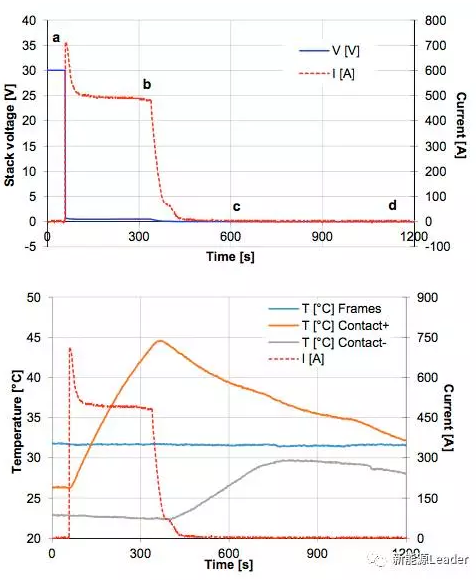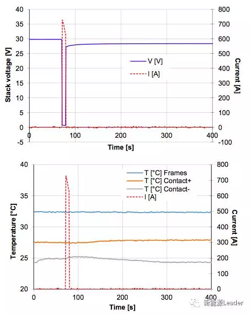 在電池拆解的情況下,電解液循環(huán)泵停止工作,但是電池內(nèi)部仍然殘留著少量的電解液,因此此時電池仍然存在著短路的風險,A.H.Whitehead針對這種情況下的短路進行了測試,短路發(fā)生后會一直持續(xù)到電流下降到非常?。?lt;5A),測試結(jié)果如下圖所示,從圖上我們可以注意到,最大短路電流仍然超過了700A,但是電流下降速度非常快,電池溫升非常小,短路12min電解液僅僅升高了11.3℃,整個過程中電池沒有發(fā)生泄漏和冒煙等情況。在27只電池串聯(lián)的情況下,電池的現(xiàn)象與這個非常類似,只不過最大短路電流提高到了830A。